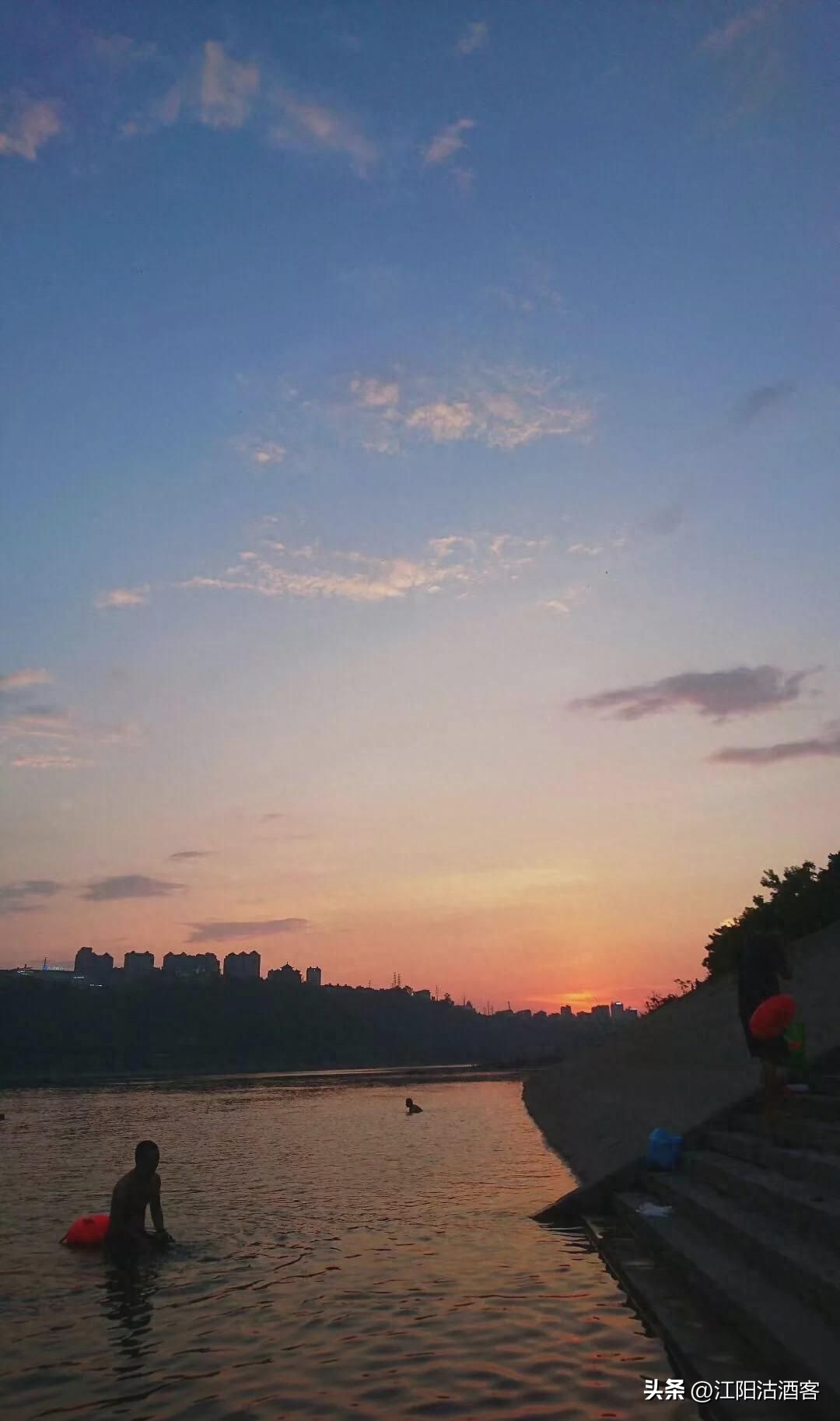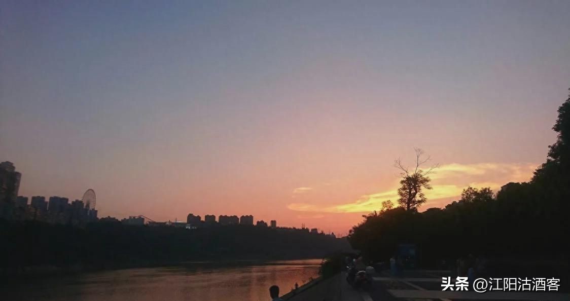 沱江晚景在泸州,晚霞倾入江水中,少了渔船烟火气,不见江边钓鱼翁。