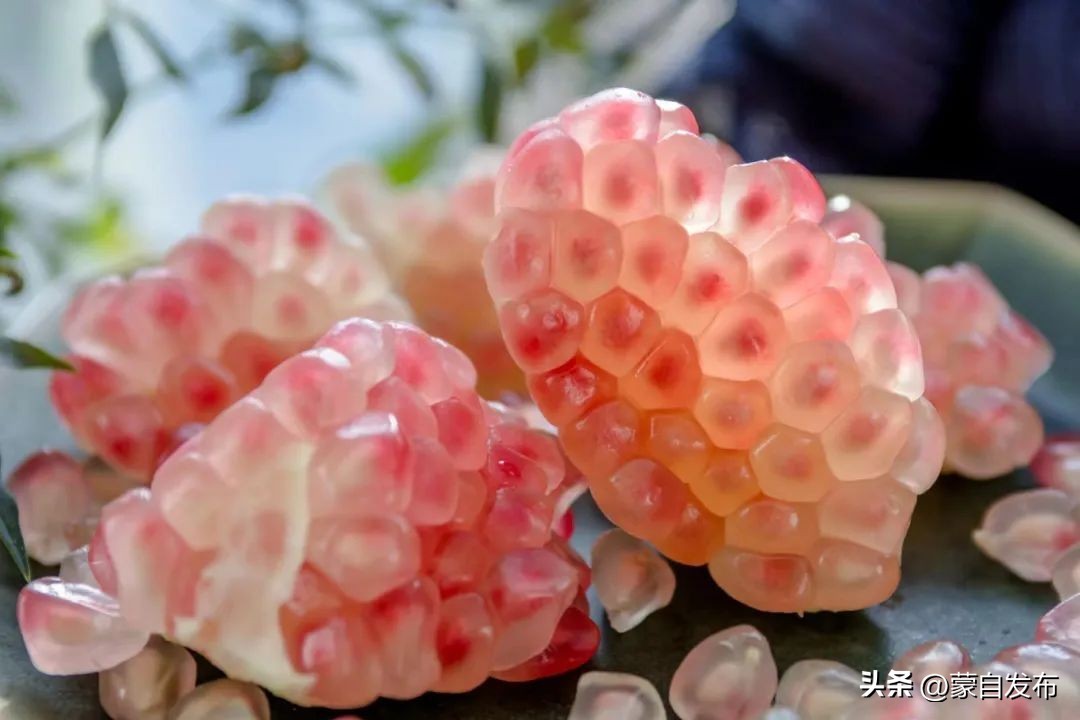 蒙自石榴果实近圆球形,果皮黄绿底透着红霞,色泽鲜艳,剥开外皮,籽籽饱满,晶莹剔透,果实清甜爽口,当汁水在口腔中爆开的时候,整个秋天都尽收在胃里。