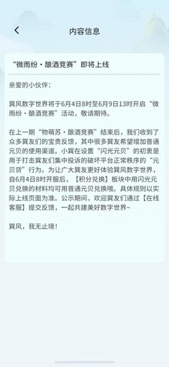 5月29日晚,巽风APP发布邮件提醒,表示6月4日将开启“微雨纷·酿酒竞赛”活动,并对设置“闪光元贝”的初衷以及未来普通元贝的使用做了说明。