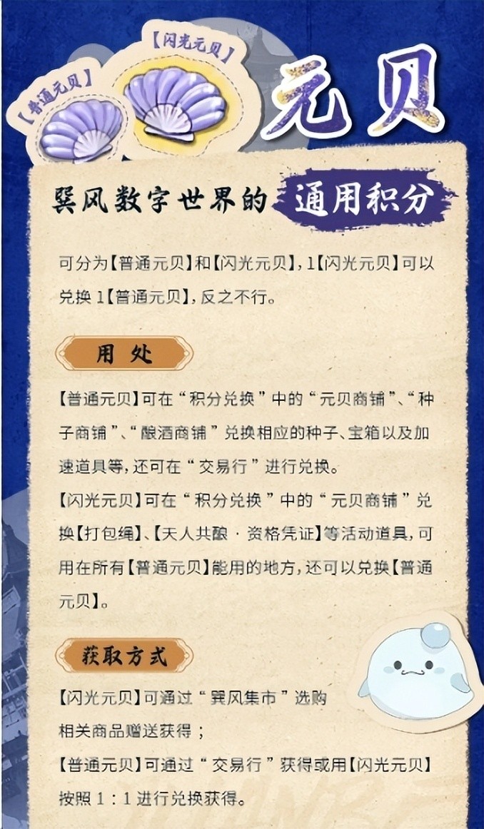 在上一期“物萌苏·酿酒竞赛”结束后,我们收到了众多巽友们的宝贵反馈,其中很多用户希望增加普通元贝的使用渠道。小巽在设置“闪光元贝”的初衷是用于打击巽友们集中投诉的破坏平台正常秩序的“元贝贷”行为。为让广大巽友更好体验巽风数字世界,自6月4日8时开服后,【积分兑换】板块中的用闪光元贝兑换的材料均可用普通元贝兑换哦。具体规则以实际上线页面为准。
