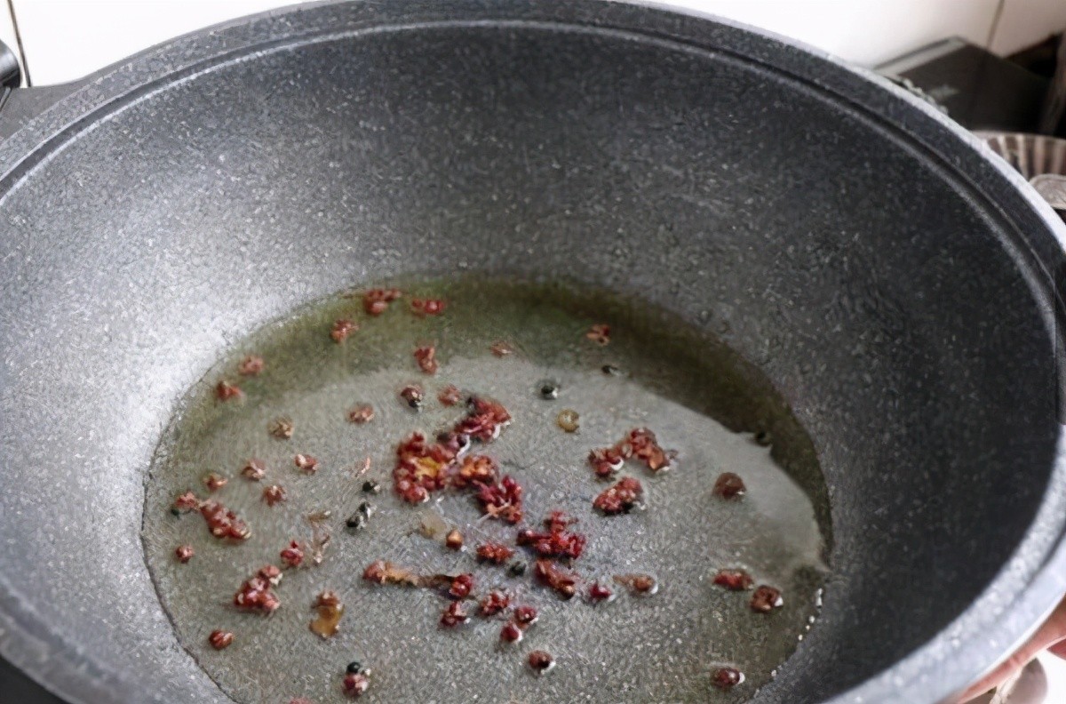 用小火把花椒籽炒香,炒出它的麻味和香味,然后把花椒籽捞出来,把提前浸泡的干辣椒丝放进来
