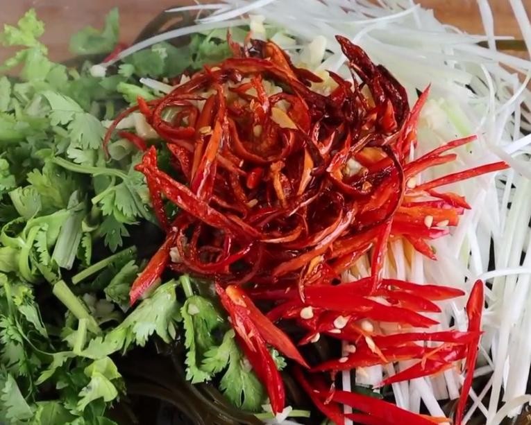 开中小火,把干辣椒丝炒出香味,然后直接把热油浇到蒜末上面,激出调料的香味