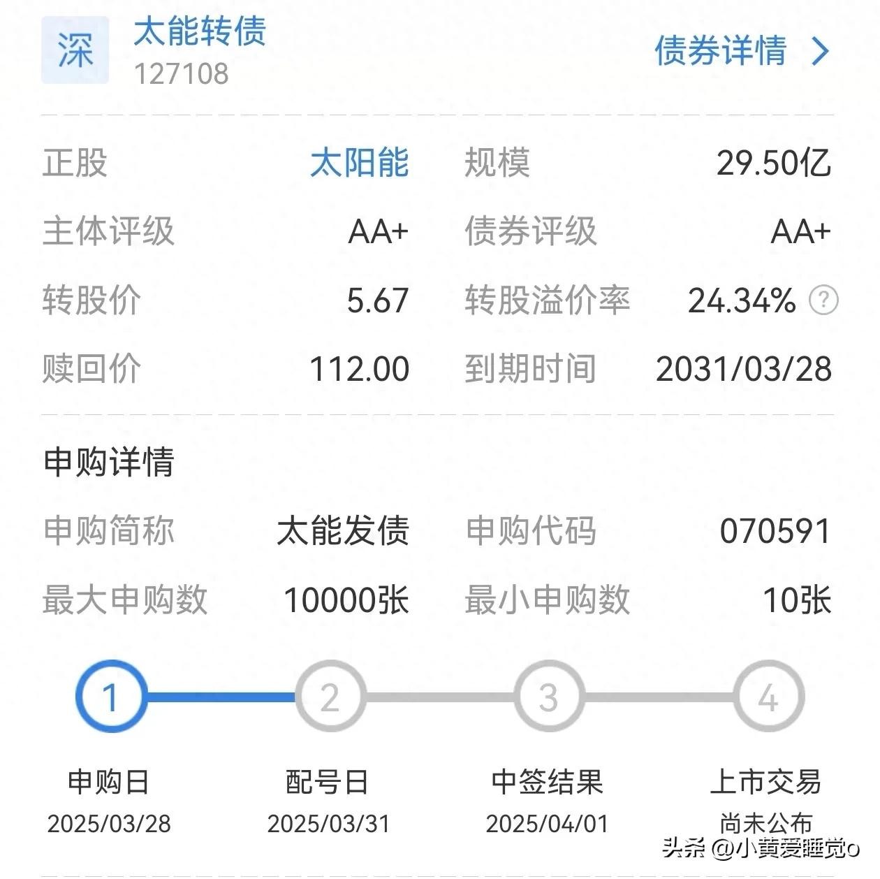 哈喽大家好,欢迎来阅读小黄的文章~今日分享的是太阳转债申购内容。以下建议仅为信息分享,无任何推广内容,具体操作自己决策喔