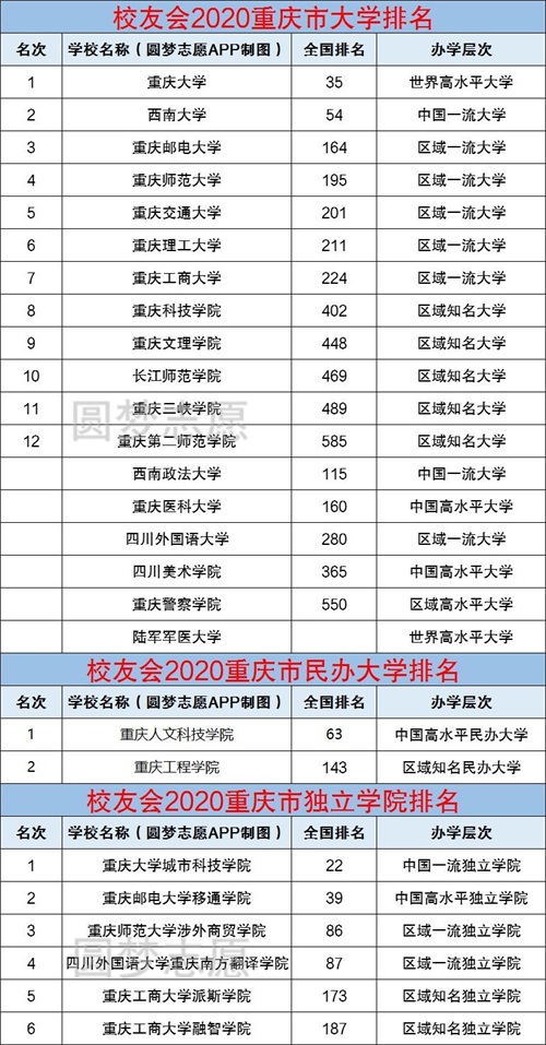 根据校友会2020年重庆市大学排行榜,小编为大家整理出了重庆市本科大学、民办大学、独立学院在市内及全国的排名情况。