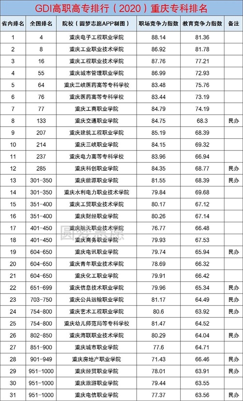 紧随其后的是重庆工业职业技术学院、重庆工程职业技术学院,它们在重庆市内的专科院校中分别排名第2、第3,全国专科学校中分别排名第8、第16。