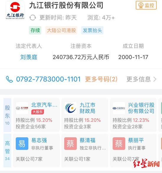 企查查信息显示,九江银行共有10个股东,九江市财政局持股比例为15.2%,与北京汽车集团有限公司并列为九江银行第一大股东。