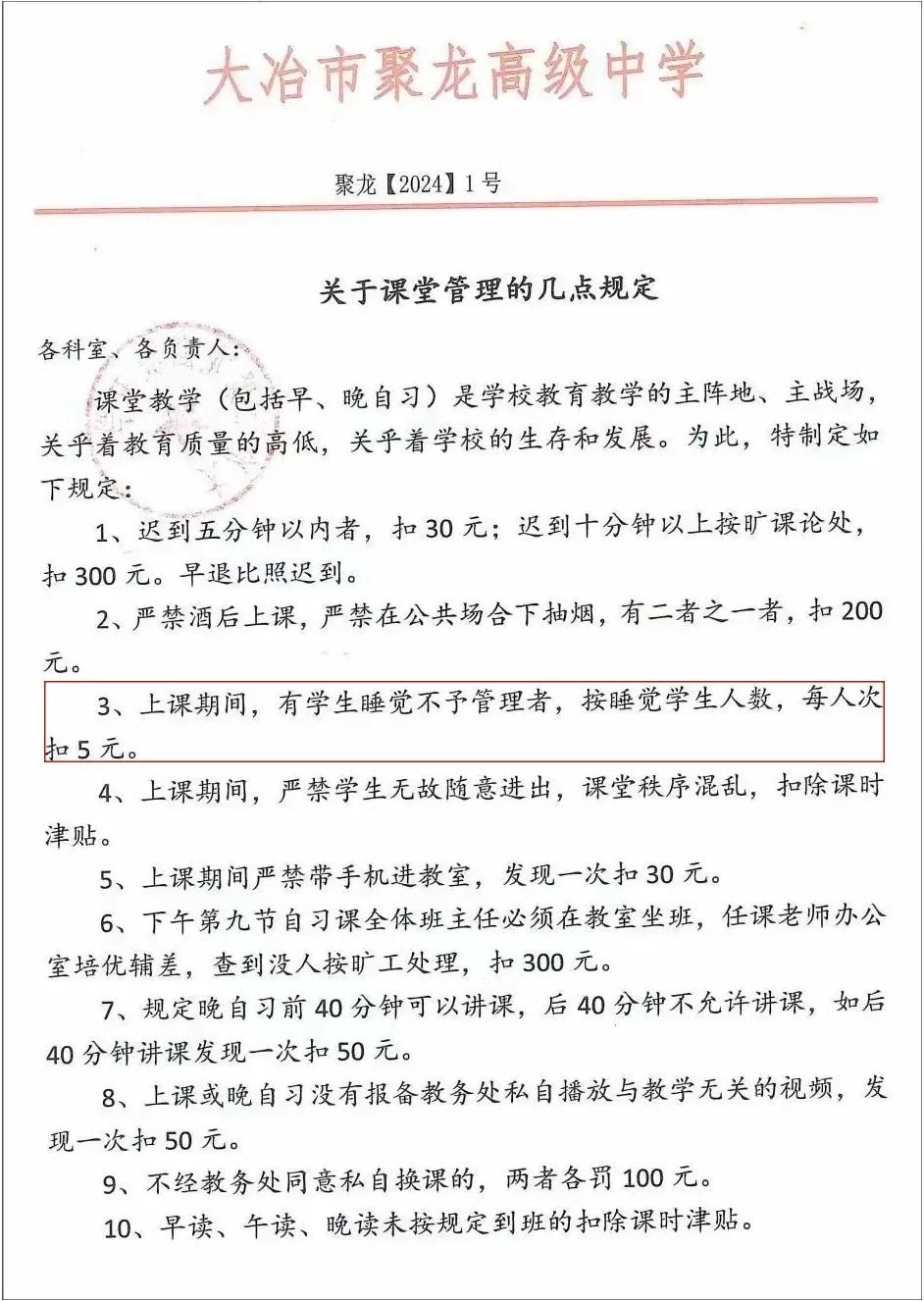 上课期间,只要有学生睡觉,每人次扣老师5块钱。