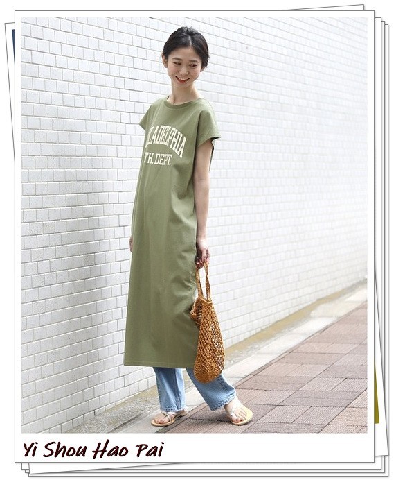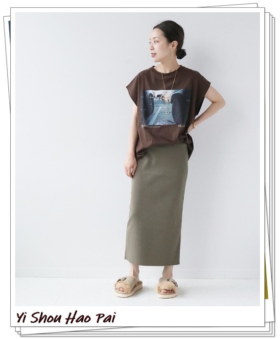 橄榄绿色的针织紧身裙,你可以一直穿到初秋。用宽松的棕色照片T恤来搭配,既展露了轻熟气质,又提升了时尚气息。