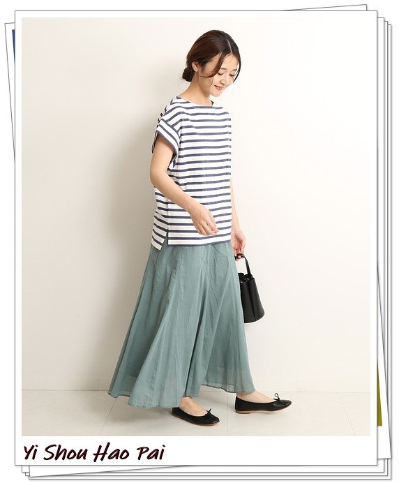 柔和的浅绿色的喇叭裙,略带透明的柔软裙摆流露出温柔女人味。用休闲的条纹衫和它搭配是很好的选择。