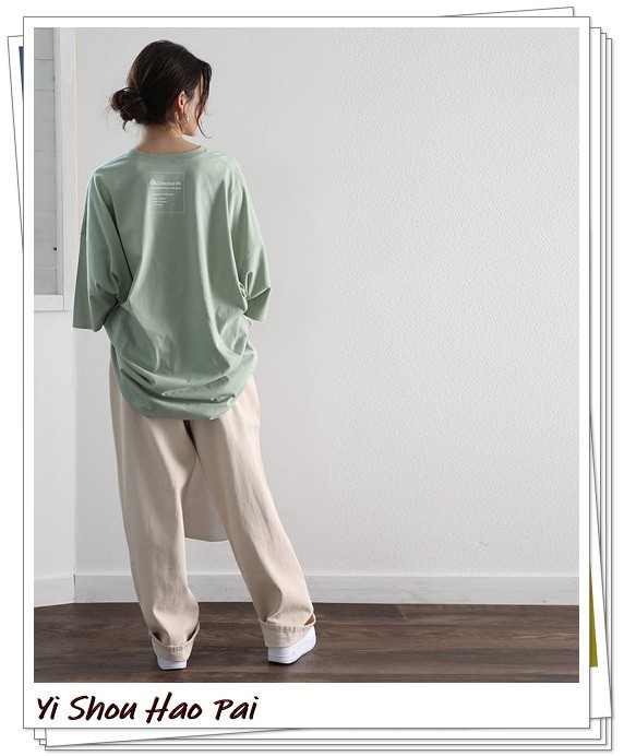 这款T恤采用宽松的设计和时尚的后背字母设计。浅绿色T恤和米白色的裤子搭配,给人明亮清爽的感觉。由于上下都是宽松的设计,因此建议将T恤的前摆塞入裤子里,露出腰线。