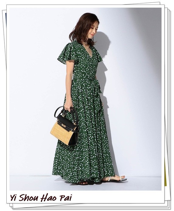 波点图案的绿色连衣裙,蓬松褶皱的喇叭裙摆和波点图案带来浪漫气息。这种偏沉稳的女人适合轻熟女人,而波点图案会透出可爱的感觉。你只需要选择简单的配件来完成造型即可。