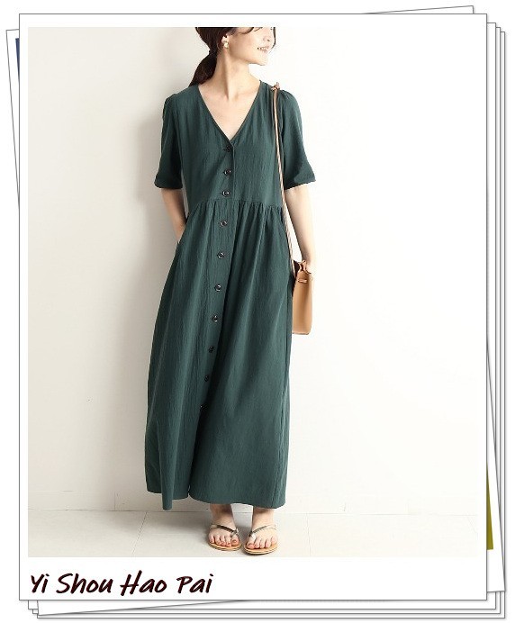 开襟纽扣设计的绿色连衣裙,V领和深绿色营造出古典感。你只需简单搭配一款迷你的单肩包和凉鞋就很完美。