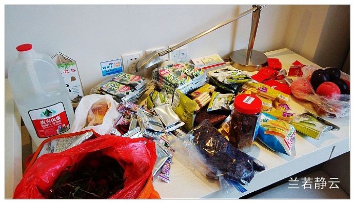 我们带去了这一大桌零食,为了茶水好喝,还拎了好几桶农夫山泉水去。
