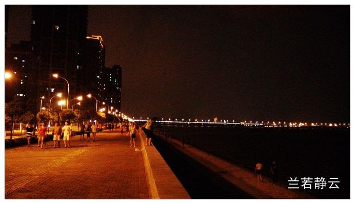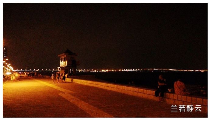 夜晚酒店外面的海滨大道非常热闹,不少市民前来这里散步吹海风,不远处的大桥就是杏林大桥。
