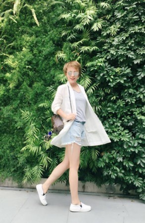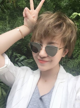 照片中的她留着亚麻色短发,墨镜样式别致,化着淡妆,对镜头嘟嘴卖萌,十分清新可人,跟之前的“马冬梅”形象判若两人。