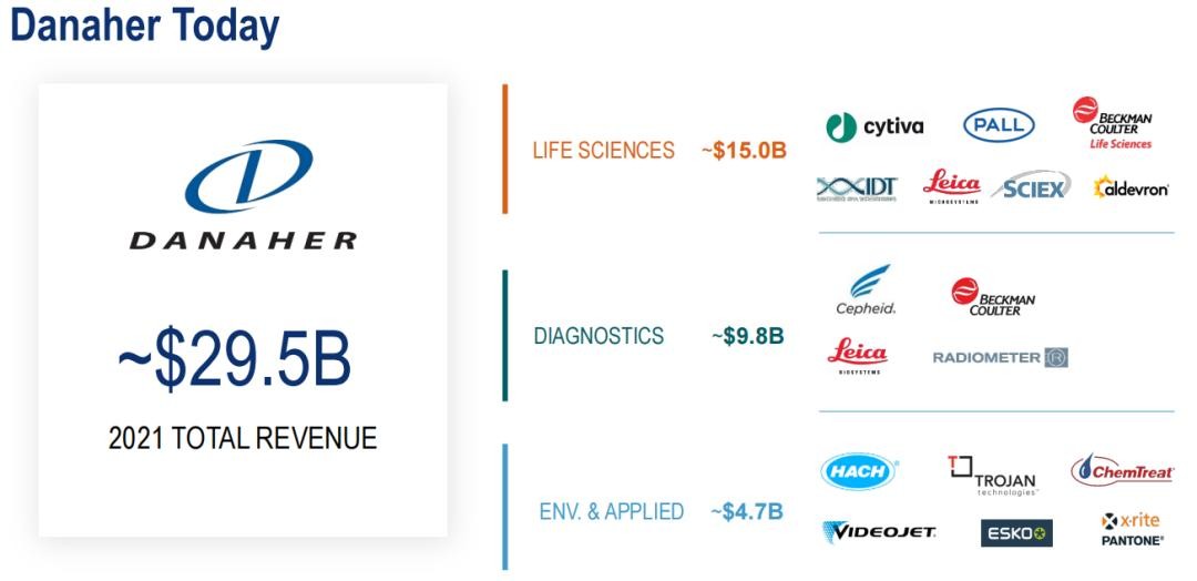 目前,丹纳赫由20多家在生命科学、诊断、环境与应用领域处于领先地位的运营公司组成,公司的研发、制造、销售、服务和行政设施遍布60多个国家/地区,由超7万名员工组成全球多元化的团队。2021年全年总收入达到了295亿美元。