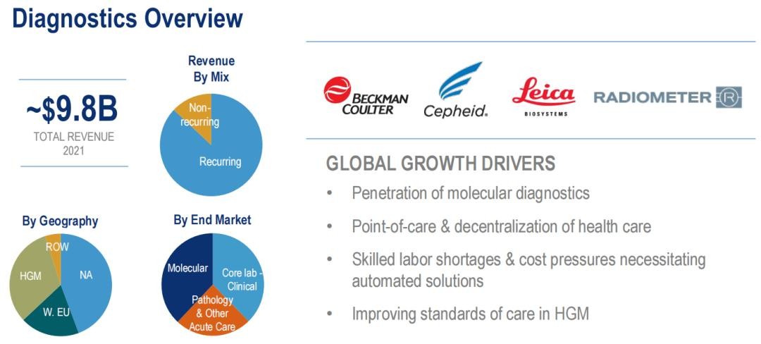 诊断部门提供临床仪器、试剂、耗材、软件和服务,供医院、诊所、参比实验室和其他重症监护机构用于诊疗决策。公司于2004年通过收购Radiometer建立了诊断业务,并通过随后的多次收购扩大了业务,包括2006年的Vision Systems、2011年的Beckman Coulter、2012年的Iris International和Aperio Technologies、2013年的HemoCue、2014年的Devicor Medical Products、2015年的西门子医疗诊断临床微生物业务以及2016年的Cepheid。