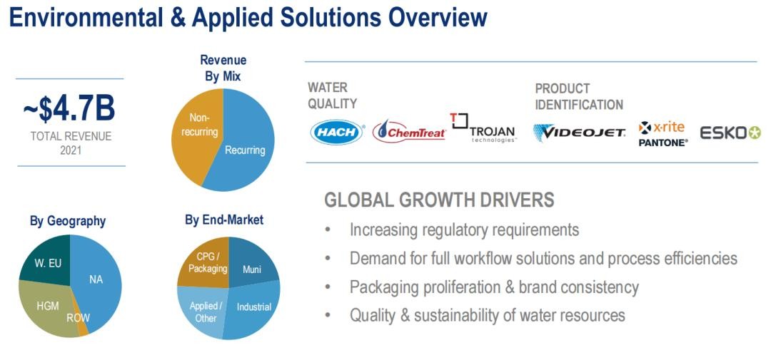 环境和应用解决方案部门业绩46.51亿美元,同比增长8%。由于2021年COVID-19疫情影响逐渐缓解,市场对于消耗品、设备的需求逐渐复苏,该部门水质业务和产品标识业务均有所增长。该部门2021年业绩在各地区分布为:北美44%、西欧23%、其他发达市场3%、高增长市场30%。