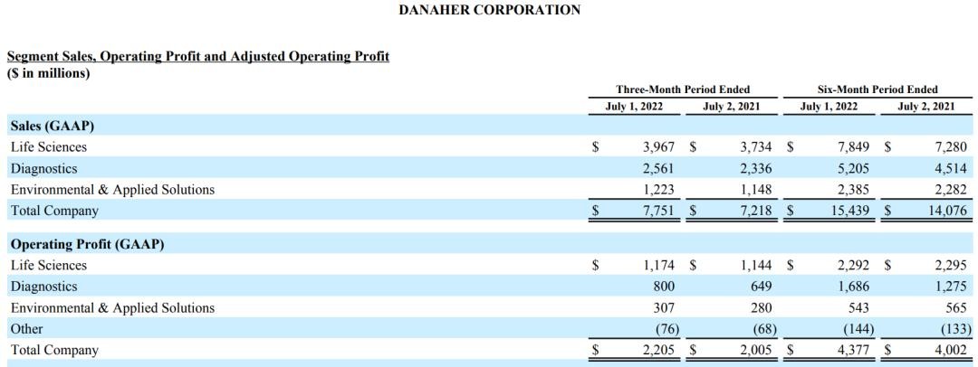 2022年上半年,丹纳赫总收入达154.39亿美元,同比增长9.5%。
