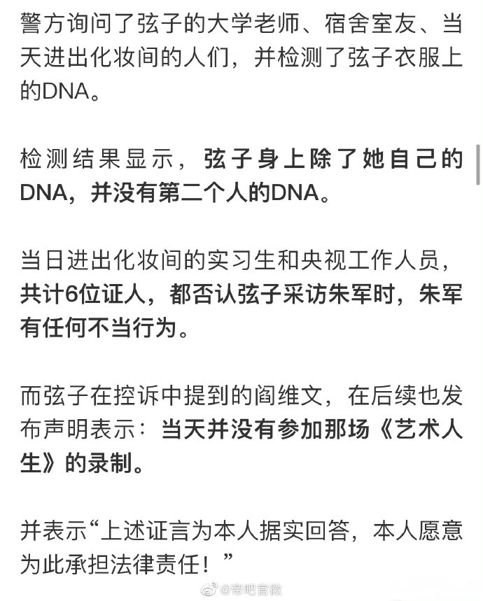 根据法院的审理,弦子的证据无法证明朱军对她进行了伤害,而且经过调查,弦子身上没有其他人的DNA,只有她本人自己的DNA,这就足以证明,朱军是无辜的,他真的没有碰过弦子,可是又有谁在意呢?