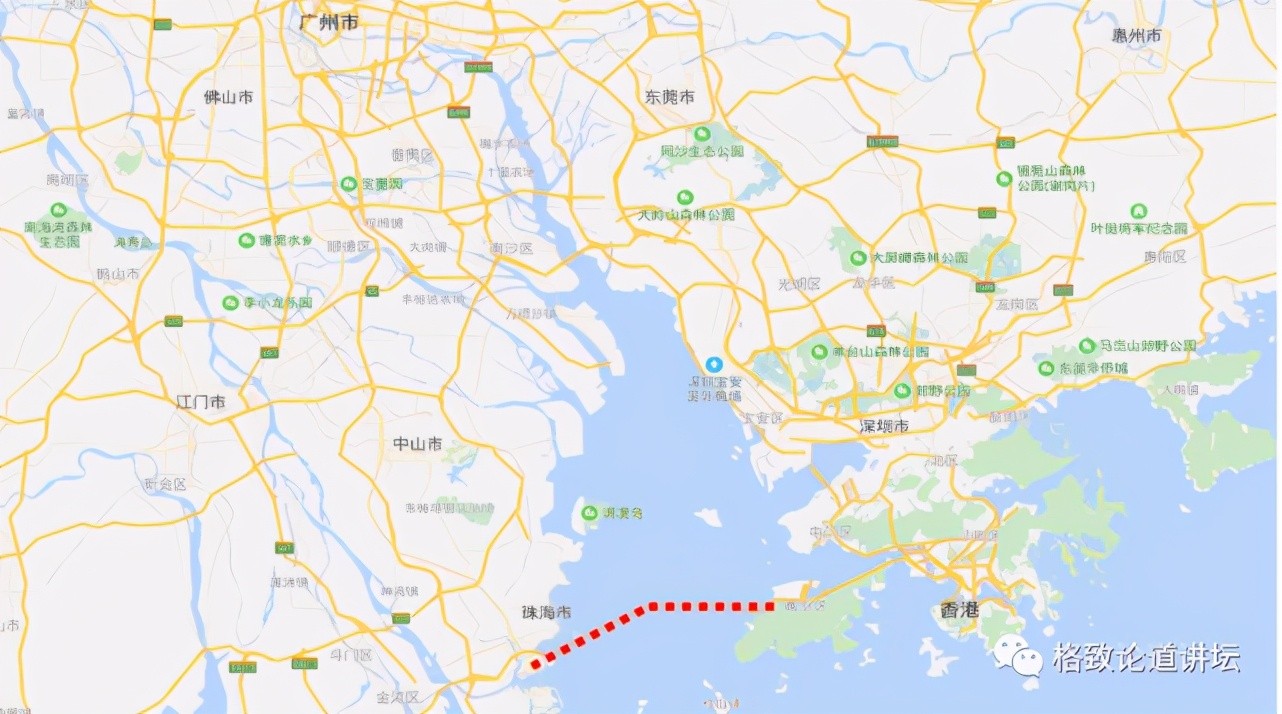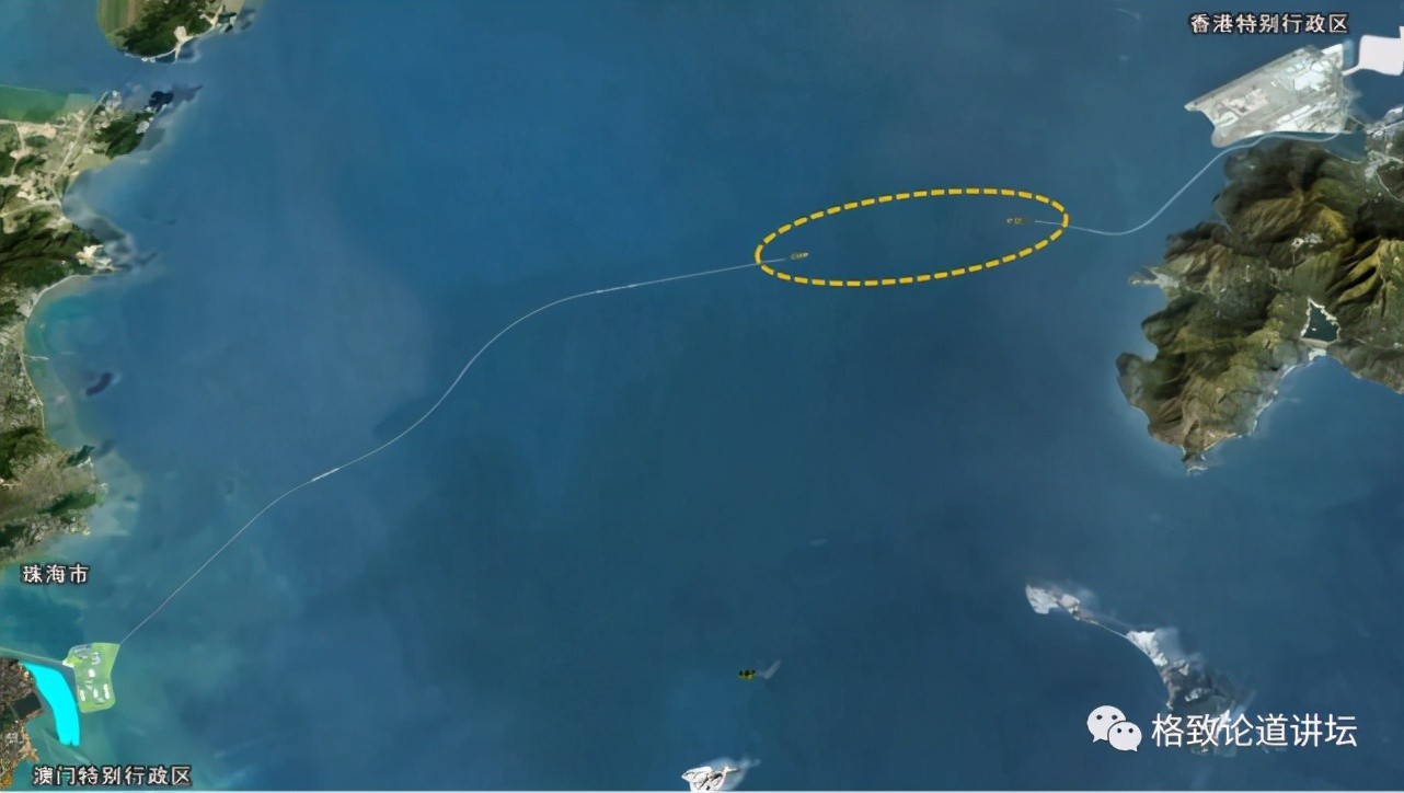 视频展示的是港珠澳大桥海中的主体工程,即下图的红色虚线部分,广州在地图的最上面。