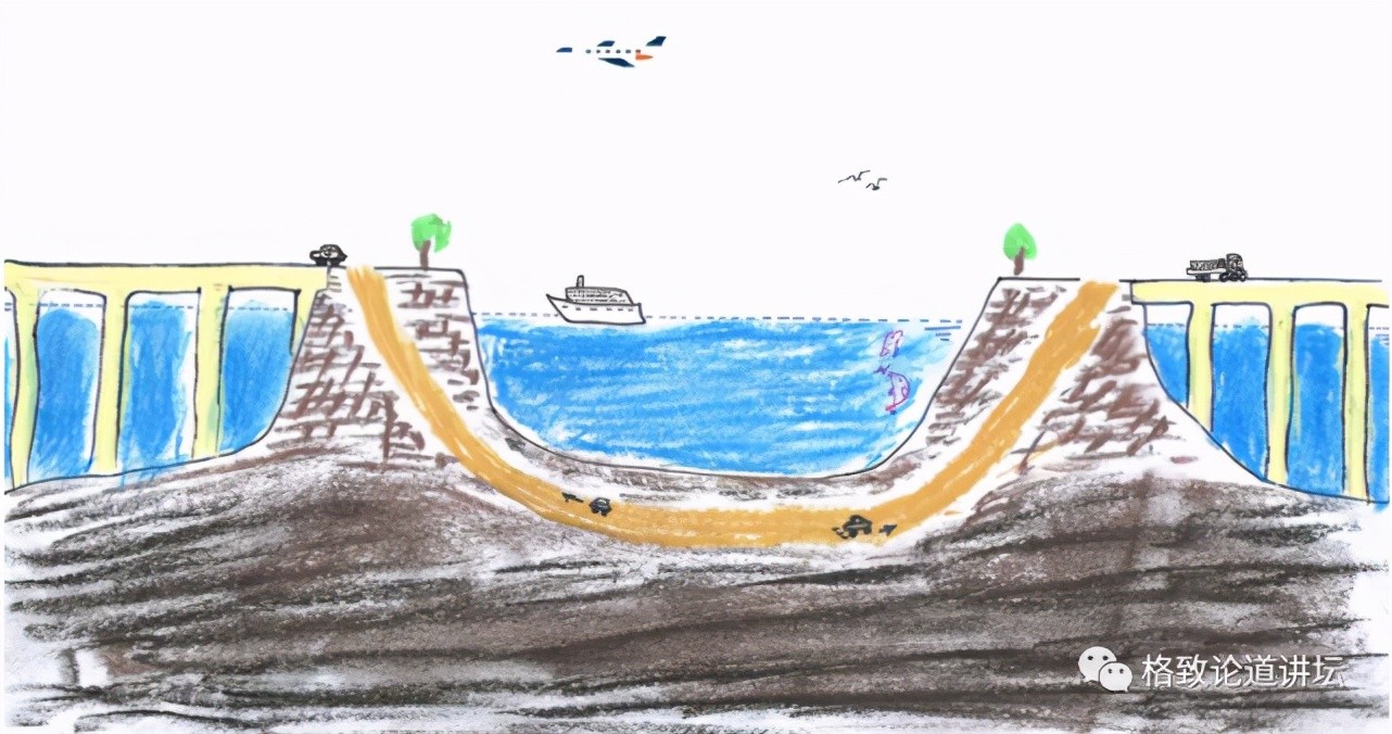 第三是环境问题。如果我们把大桥沿着长度方向从侧面剖开,就会发现,桥墩是在海水里的,每天潮水涨落时,桥墩会影响海水的交换,同时没入水中的人工岛也会带来这个影响。因为海底隧道在海床面之下,所以只有海底隧道不会产生影响。
