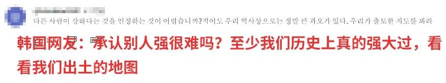 面对嘲讽,一位韩国网友称“承认别人强很难吗?至少我们历史上真的强大过,看看我们出土的地图”。不过韩国所谓“出土的地图”并不能成为其夸大现今国土面积的依据。历史上的韩国与如今的韩国在领土范围等方面有着明确的界定,不能混为一谈,且其出土地图的真实性与权威性也有待考证,这种强词夺理的回应难以令人信服。