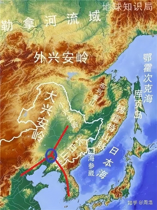 东北亚地形图(外兴安岭以北,包括库页岛以前都是中国的领土)