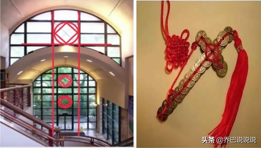 这是文娱中心(棺材楼)建好的内外照片,仔细看的话能看出玻璃上面雕刻着3个铜钱的图案,而这三个图案串联起来就是下面这柄金钱剑。