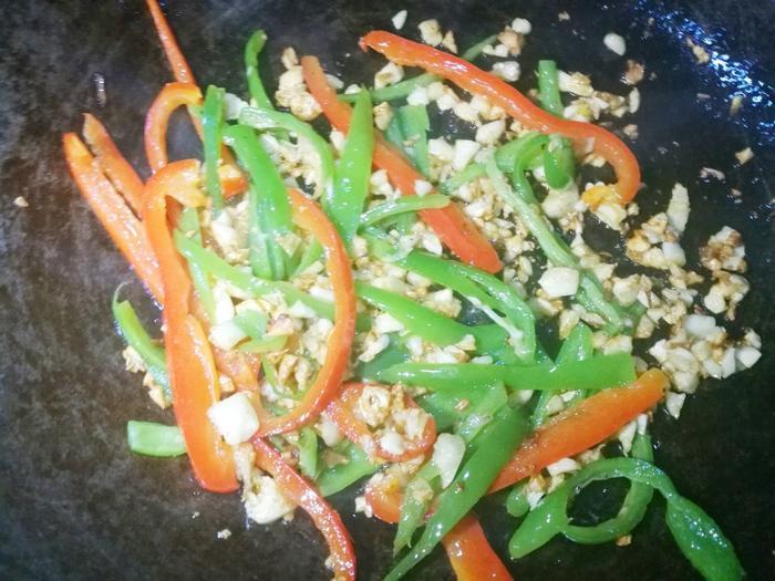 7、继续放入青椒丝和红椒丝,再下入杏鲍菇煸炒,直到杏鲍菇变软即可。