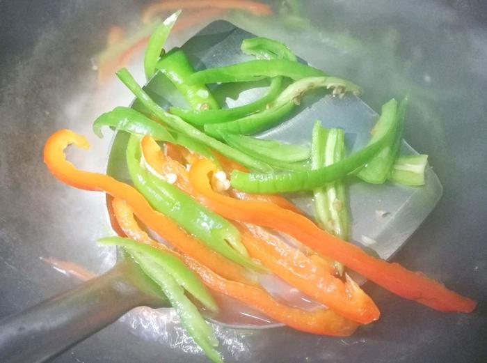 5、顺便把青椒和红椒也放入水中焯一下,时间不要太长,大约30秒之内就可以快速捞出来,沥干水分备用,这样焯一下炒制的时间就会缩短,而且更容易入味,也不会有太辣的口感。