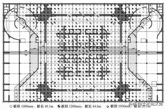 桩筏体系可理解为是地基土-桩-筏板相互作用的一个有机整体。本工程桩基础设计使用年限为50年,耐久性100年;建筑桩基设计等级甲级,安全等级为一级;主要抗震性能目标为桩身强度满足中震弹性和大震不屈服要求。工程桩主要包括三种类型:位于核心筒和巨型柱下P1型(桩径1200mm、桩长44.6m);塔楼下其他区域P2型(桩径1000mm、桩长40.1m);塔楼与纯地下室间过渡桩P3型(桩径1000mm、桩长26.1m,为边缘过渡桩),桩位布置见图8。