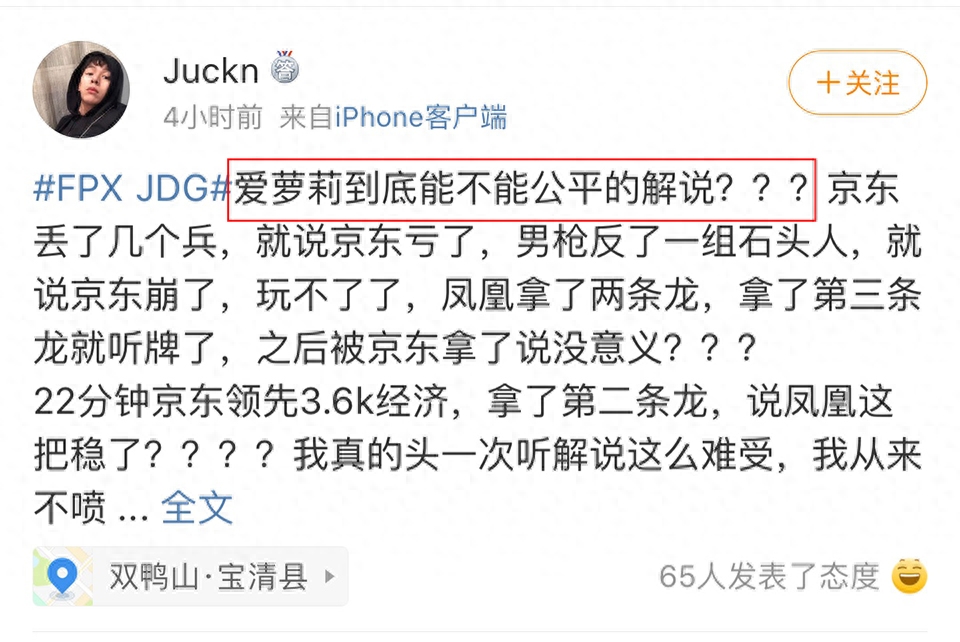 这位网友的言论非常有代表性,而且他还是FPX的粉丝!他表示:爱萝莉到底能不能公平的解说?京东丢了几个兵,就说京东亏了。男枪反了一组石头人,就说京东崩了,玩不了了。凤凰拿了两条龙,拿了第三条龙就听牌了,之后被京东拿了说没意义?