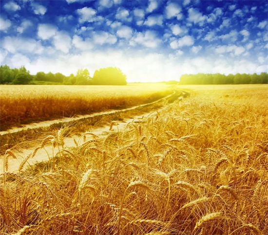 石榴花开,麦子成熟,蓝天白云下,金黄色的麦田一望无际,美不胜收。