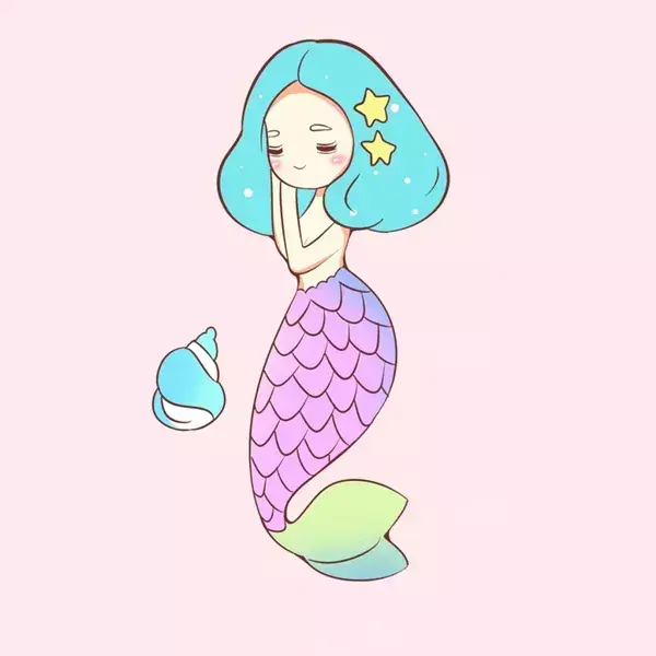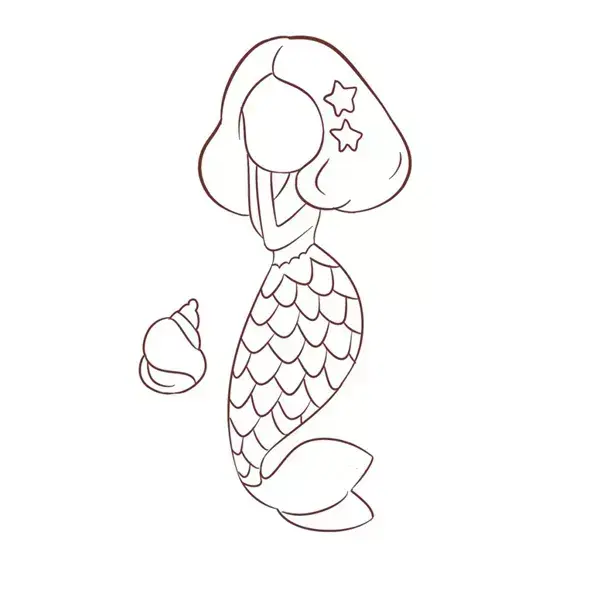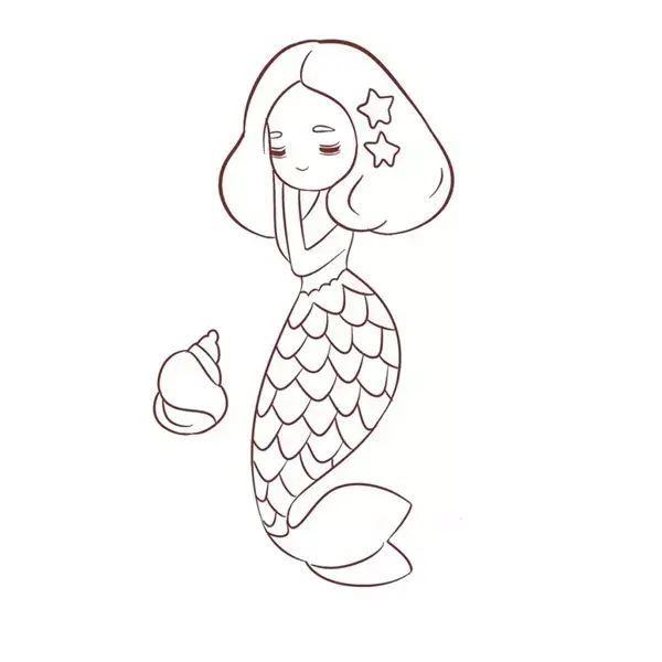第六步:给美人鱼的头上画两个海星做头饰,身旁画上一个海螺,这样更有海洋的气息。