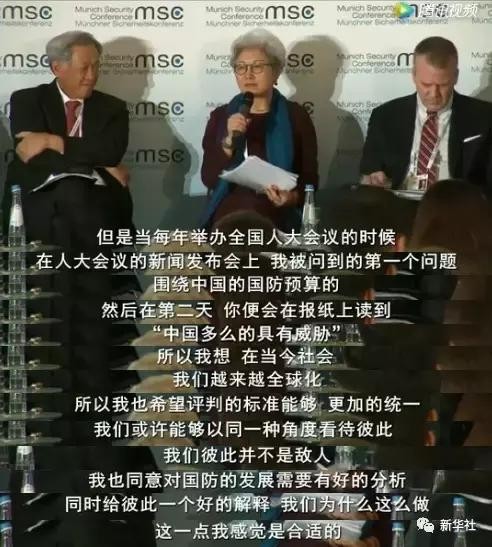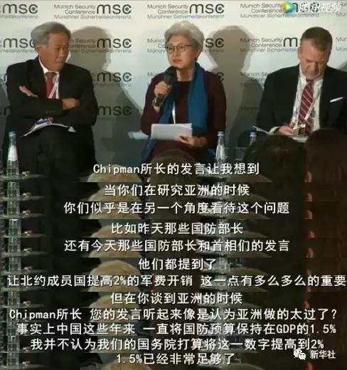 傅莹说,此次慕安会的热点问题是如何确保北约成员国将国防预算提高至国内生产总值(GDP)的2%,分担安全经费。但刚才提到中国的国防预算时态度明显不同。