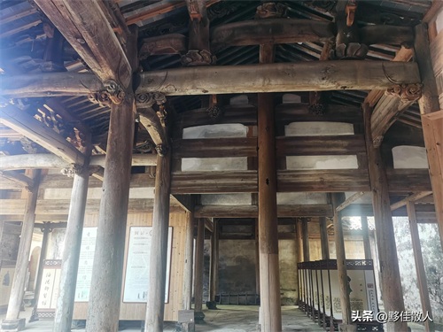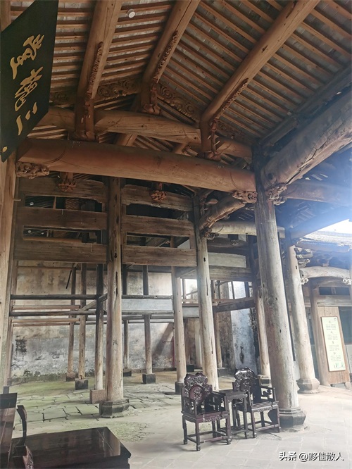 溪头三槐堂建在溪头村中心,坐北朝南,在当地又被称作“金銮殿”,厅正中悬挂的“龙章宠锡”巨额鎏金牌匾。整体结构规矩严谨,以大门为中轴线向两边延伸,室内遍布“满堂柱”,以柱、梁、坊之间的榫卯契合支撑起整座建筑,在视觉上拓宽了内部空间。