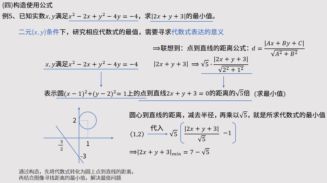 本题通过构造,先将代数式转化为圆上点到直线的距离,再结合图像寻找距离的最小值,解决最值问题。