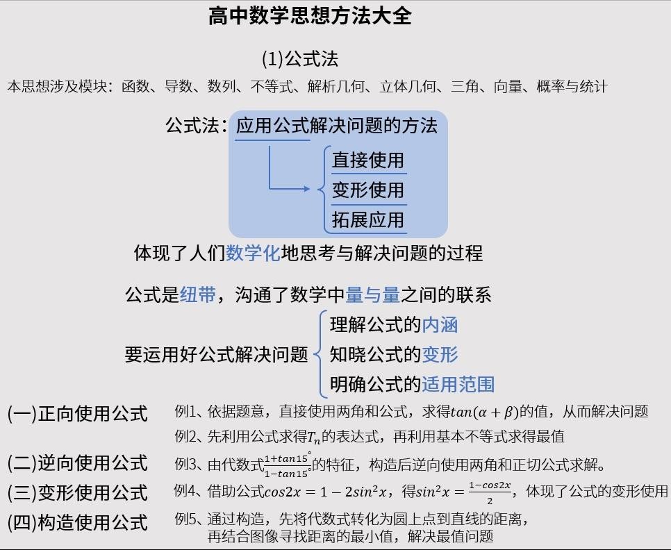 这个视频我们来讲解公式法的相关内容,高中数学思想方法大全之一,公式法。本思想方法涉及模块,函数、导数、数列、不等式、解析几何、立体几何、三角、向量、概率与统计。