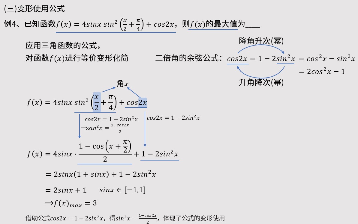 例四,已知函数FX的解析式,是一个由三角函数所组成的函数,求这个函数的最大值。