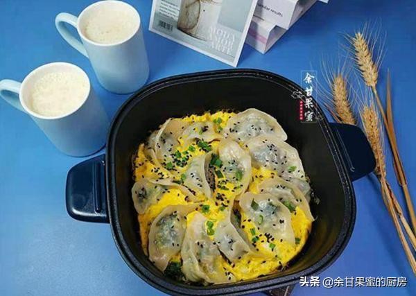 做法:饺子入锅后,加入适量清水,大约在饺子的三分之一处,水分烧干后淋入蛋液,小火煎一煎至鸡蛋熟透,撒上葱花,熟芝麻即可出锅了。