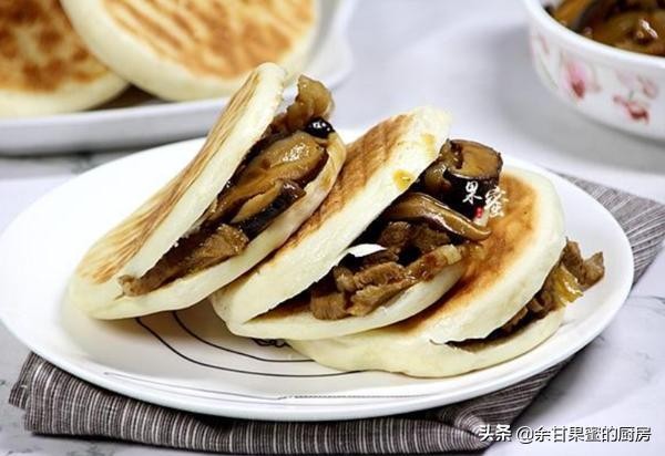 第三道:香菇肉夹馍——街上热卖的小吃面食,有菜有主食,煎一煎出锅,夹入的馅料也随意,香菇肉丝、牛肉、鸡肉都可以,丰富味美,管饱又有营养。