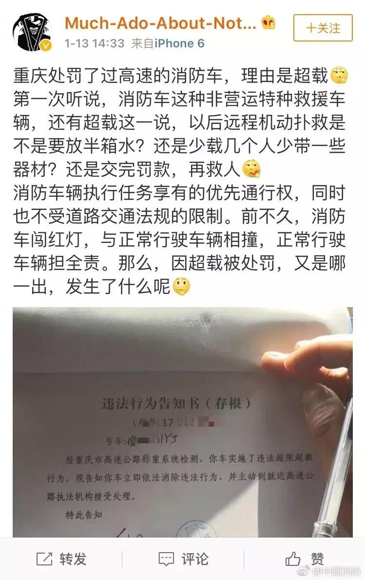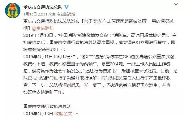 2019年1月13日,“中国消防”新浪微博发文称:“消防车走高速因超载被处罚”。获知该信息后,重庆市交通行政执法总队高度重视,成立调查组立即进行核实,现将有关情况说明如下: