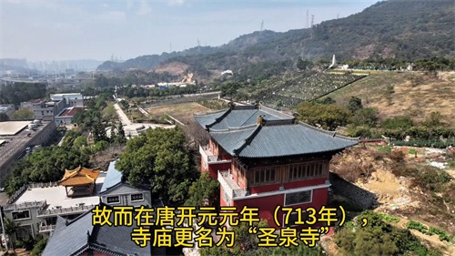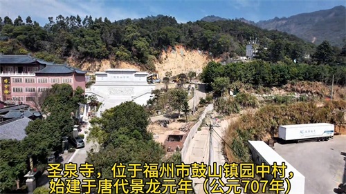 这里是圣泉寺。圣泉寺位于福州市鼓山镇园中村,始建于唐代景龙元年(公元707年),初名"法华寺"。传说僧人怀一苦于寺内用水困难,一日见两禽争斗,十分好奇,以杖拄地,顿时泉水涌出。故而在唐开元元年(713年),寺庙更名为"圣泉寺"。