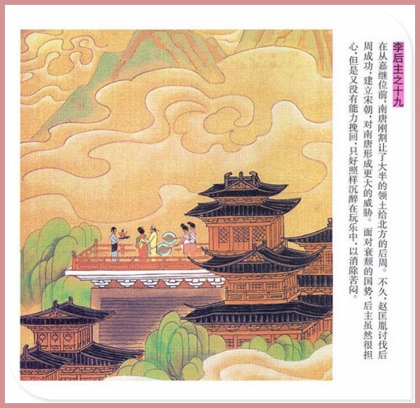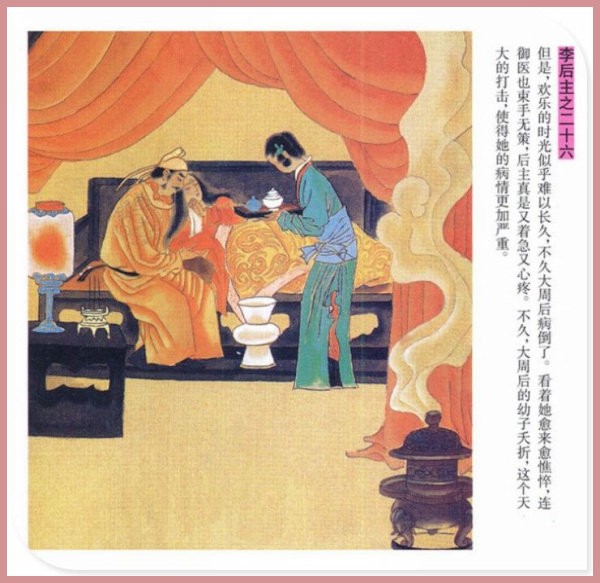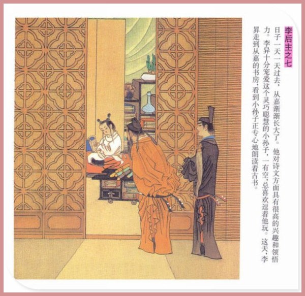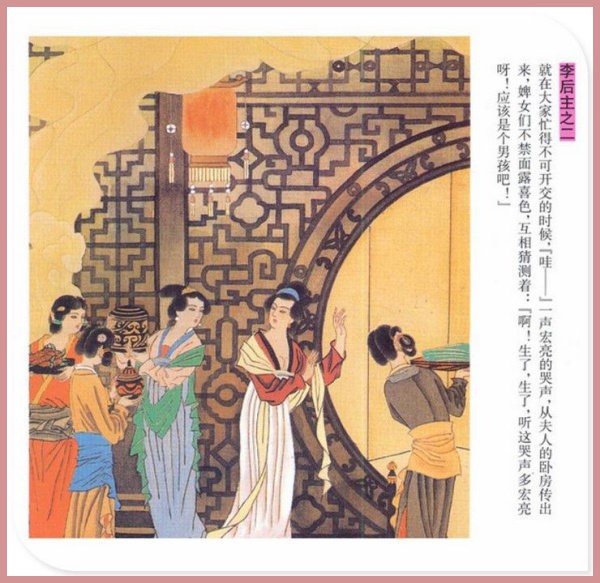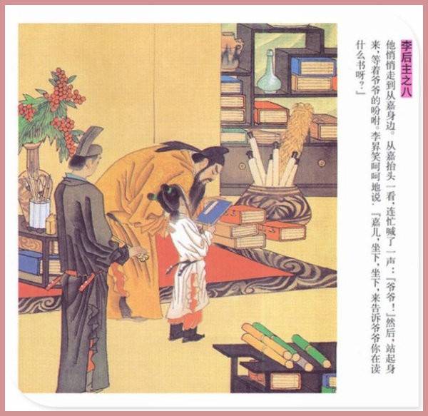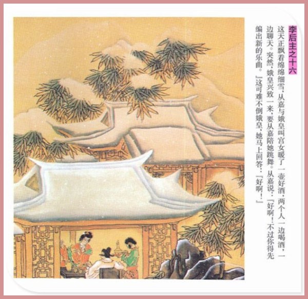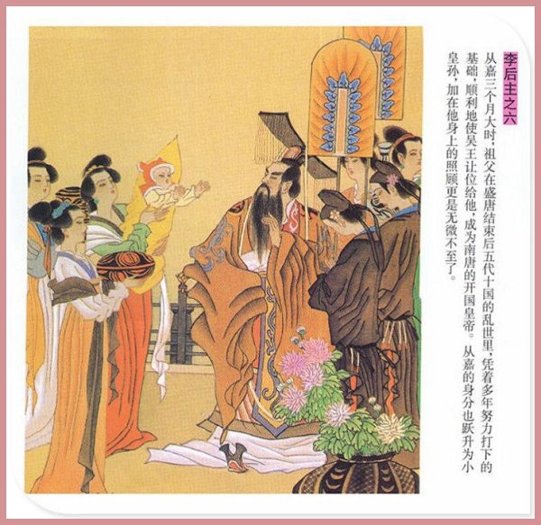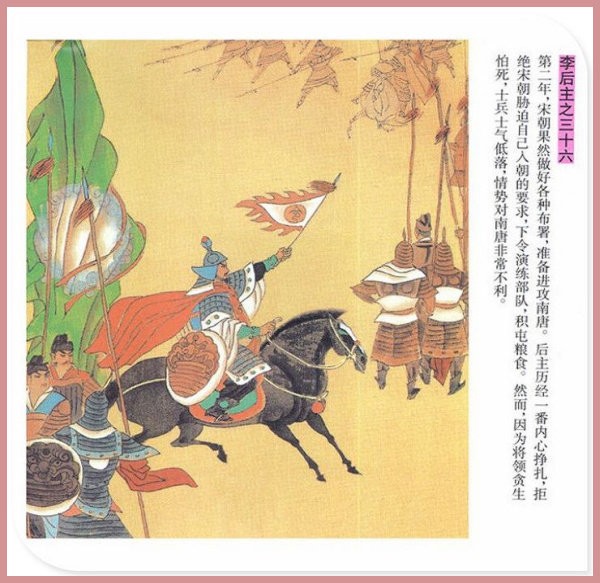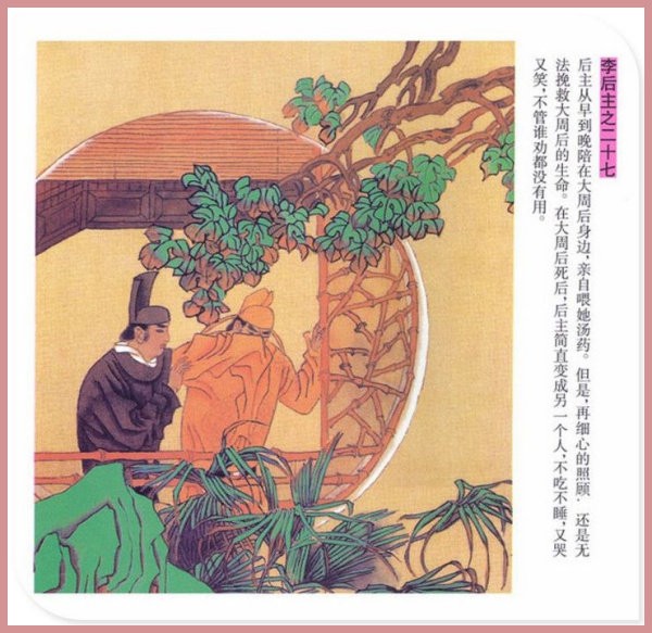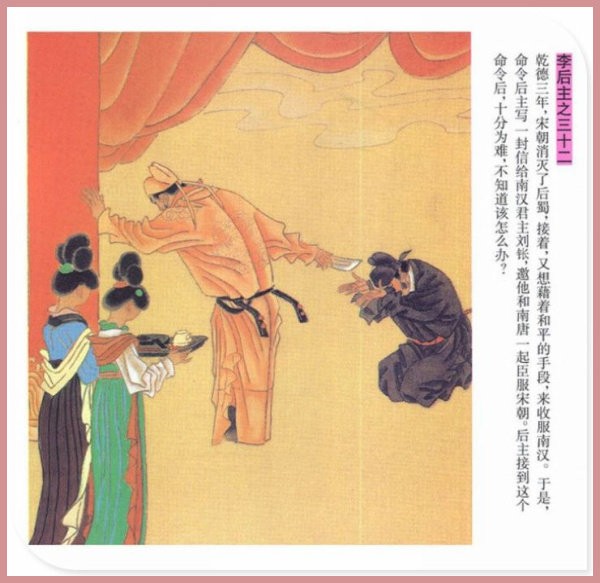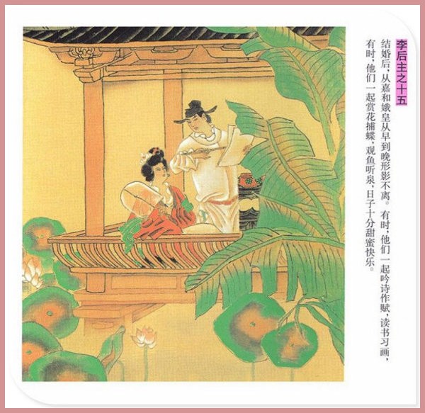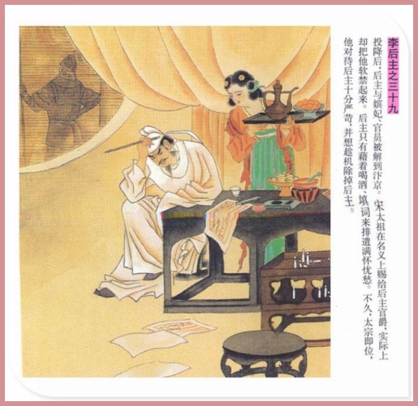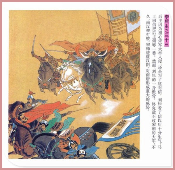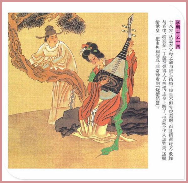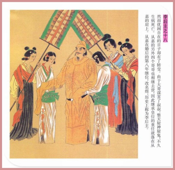 萧玉田、马唯驰的彩绘连环画《李后主》,说的是五代十国时南唐国君李煜的故事。李后主字重光,初名从嘉,后以“日以煜之昼,月以煜之夜”之意改名李煜。961年-975年在位,开宝八年,宋军破南唐都城,李煜降宋,被俘至汴京。后因作感怀故国的名词《虞美人》而被宋太宗毒死。李煜虽不通政治,但艺术才华非凡。精书法,善绘画,通音律,尤以词的成就最高。在政治上失败的李煜,却在词坛上留下了不朽的篇章,李煜在中国词史上占有重要的地位,被称为“千古词帝”。