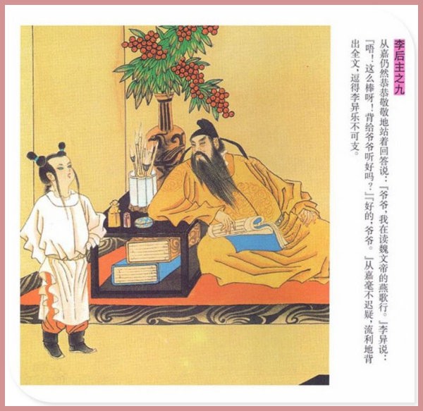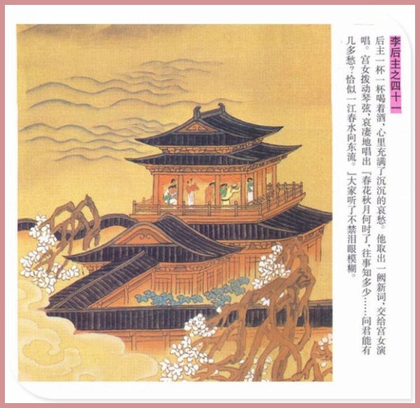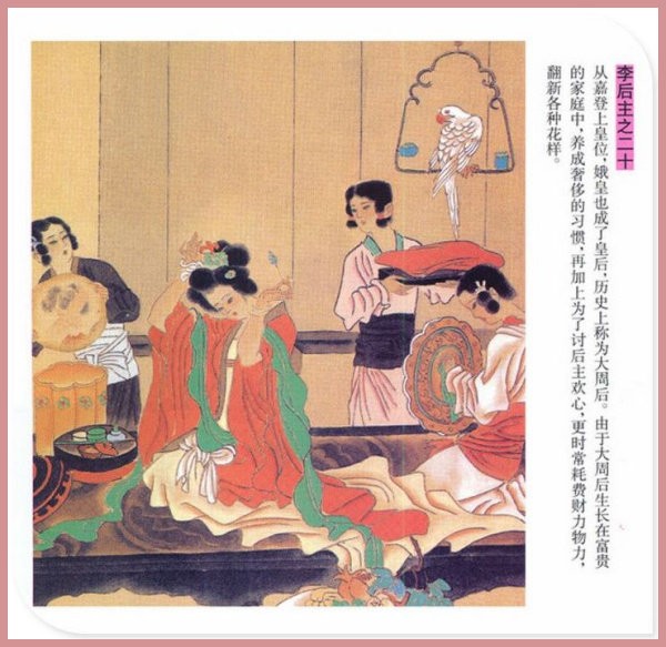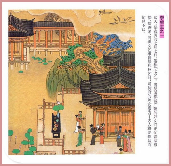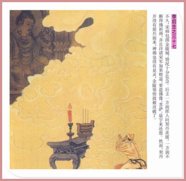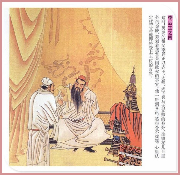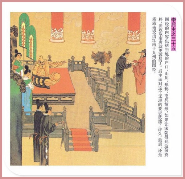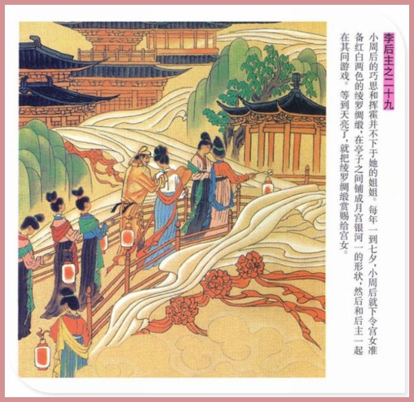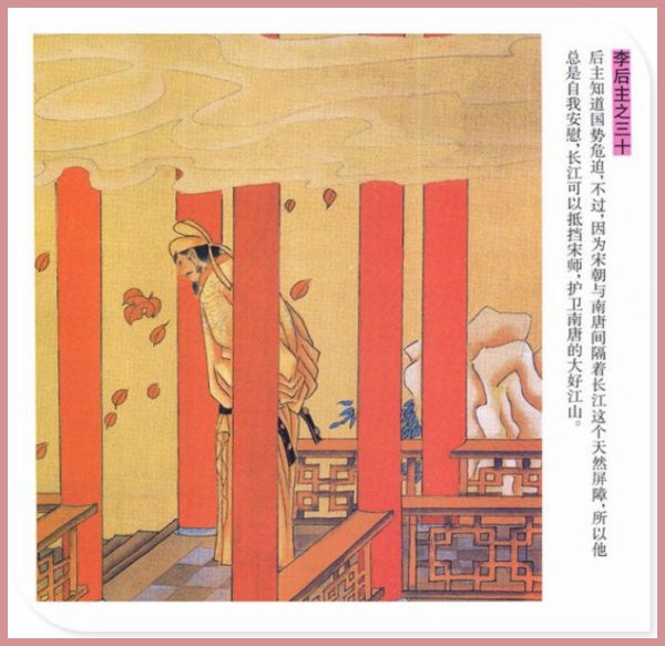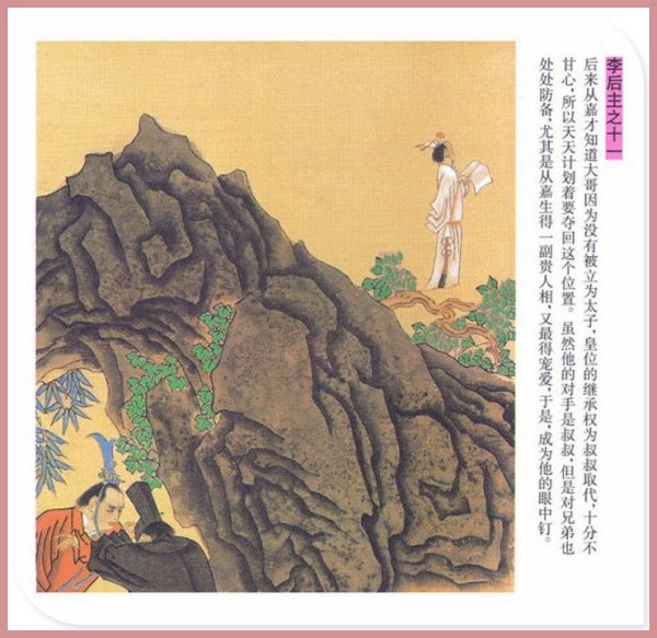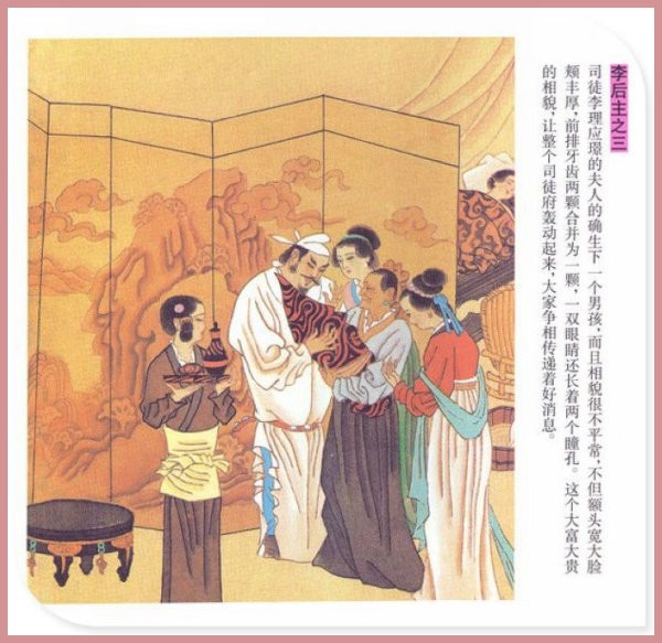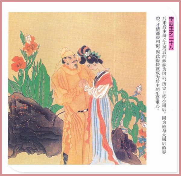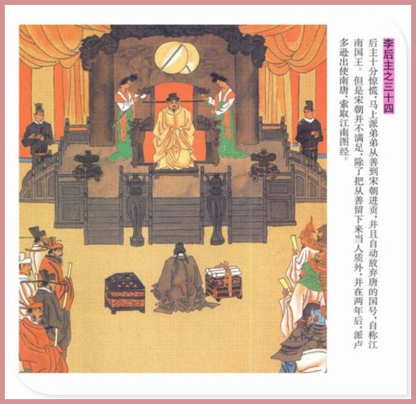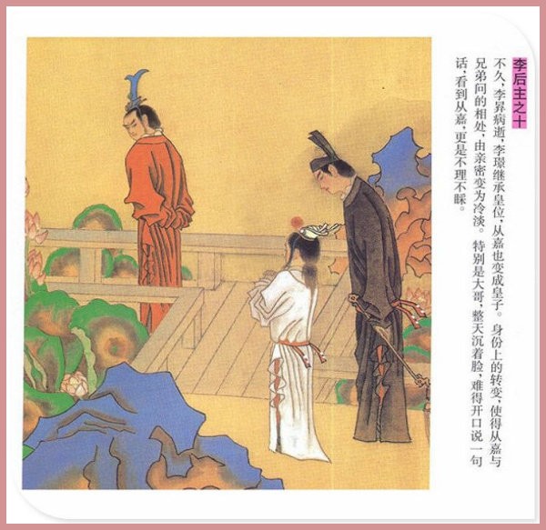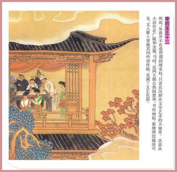 萧玉田、马唯驰的彩绘连环画《李后主》,说的是五代十国时南唐国君李煜的故事。李后主字重光,初名从嘉,后以“日以煜之昼,月以煜之夜”之意改名李煜。961年-975年在位,开宝八年,宋军破南唐都城,李煜降宋,被俘至汴京。后因作感怀故国的名词《虞美人》而被宋太宗毒死。李煜虽不通政治,但艺术才华非凡。精书法,善绘画,通音律,尤以词的成就最高。在政治上失败的李煜,却在词坛上留下了不朽的篇章,李煜在中国词史上占有重要的地位,被称为“千古词帝”。