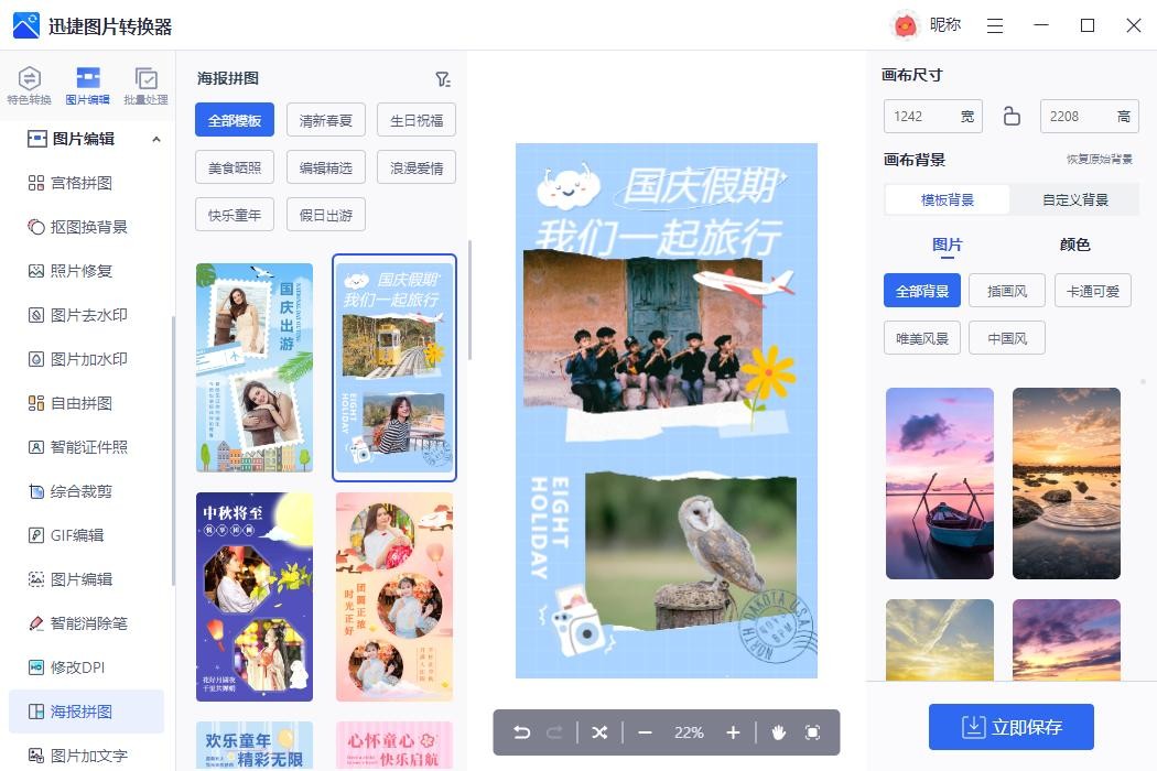 也可以使用海报拼图,海报拼图中有很多精彩模板,每个模板都能使用,也可以自定义调整模板样式;同时还能设置画布尺寸和背景,非常实用。