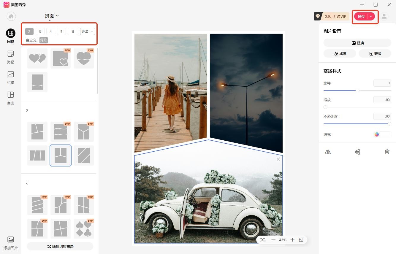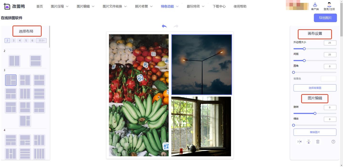 在【选择布局】中找到想要上传图片张数对应的不同模板,选择一个之后导入图片,还能设置画布、编辑图片、调整图片位置等操作,完成后导出拼图即可。