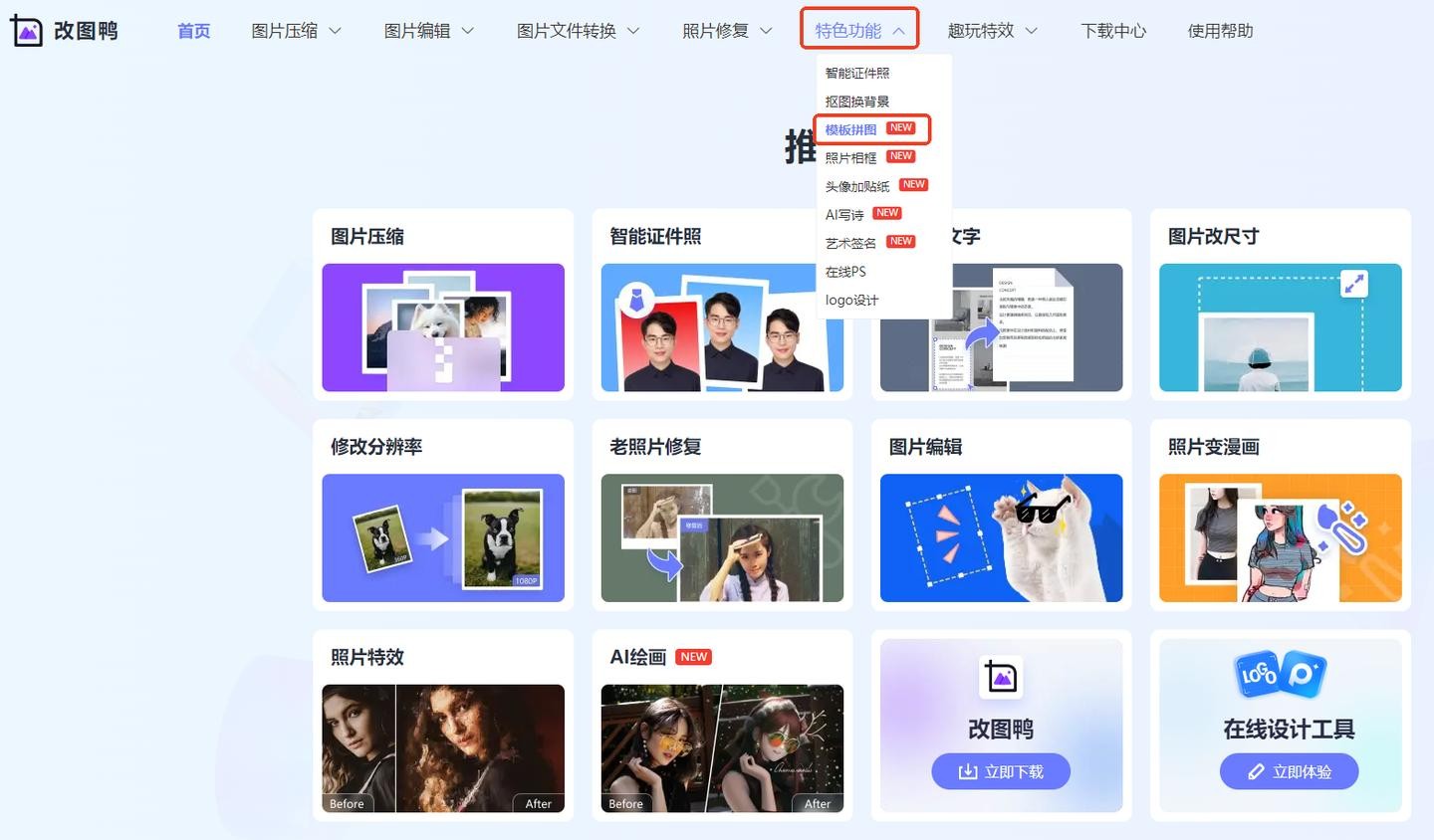 操作很简单,打开网站,选择【特色功能】中的【模板拼图】。