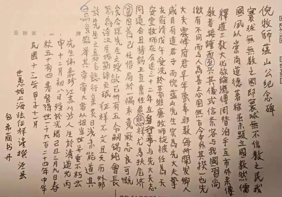 倪牧师蕴山公纪念碑 寰球无无教之国,即寰球无不信教之民,我国夙以崇尚道德著称,虽未显立国教,然儒释道三教大化弥纶流传,罔替洎乎互市外来传教者接踵而至,兴其仪式信条,容与我国习尚微有不同,而与人为善之心固无古今中外,其揆一也。(??)先大夫云峰府君早年崇奉耶教,每所阐发乡人咸目(羡慕?)有道君子。而倪蕴山先生实为先大夫挚友。前清戊午受洗于慕维廉牧师,旋被任为天安堂牧师,在会达三十二年,立身行事与先大夫志同道合,且持躬正直、秉性慈祥,尤为扶危济贫引为己任。惜局于一隅未竟厥志良可慨矣。今距先生之殁数已三十有五,令嗣锡纯会长属为诠次厓略勒诸贞珉。征祥不文且久历外邦,于(??)先生嘉言懿行亲灸日浅,未能道其万一辄,举其荦荦大者以诏当世并垂不朽云(??)。先生讳嘉珍,江苏川沙人,生于清道光丙申十二月初八日,殁于光绪己丑三月九日,春秋五十有四,基督降世一千九百二十四年,(立此碑文于?)中华民国十三年甲子十一月。